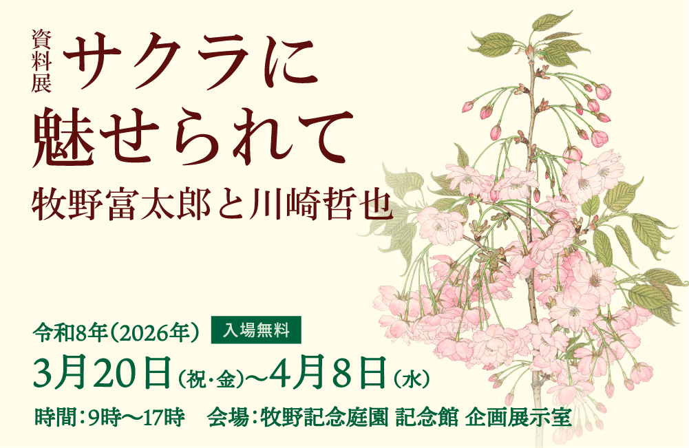 サクラの研究者川崎哲也は、若い頃、植物学と植物の描き方について牧野富太郎の指導を受け、精緻なサクラの図を残しました。また、『牧野日本植物図鑑』の改訂・増補の際に作図を担いました。本展では川崎が描いたサクラの図(複製・一部原図)と関連資料を展示いたします。